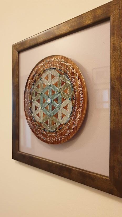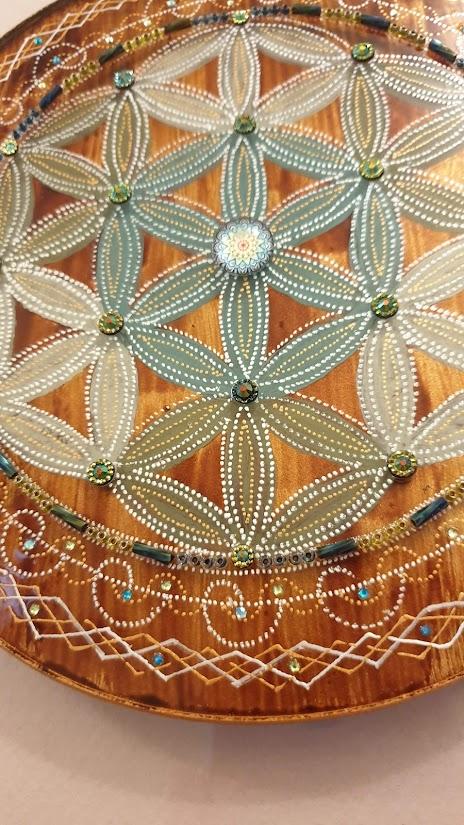 A mandala üvegre festett, mérete keretezve kb. 33x33 cm.