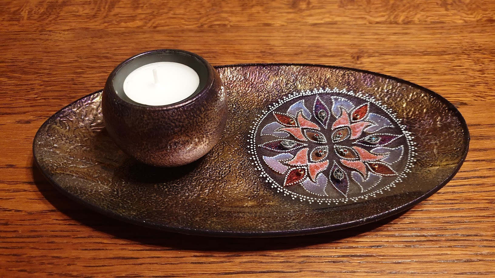 A mécsestartó gyertyaöntő mester keze munkájka, a mandalával dekorált tartó saját alkotásom.